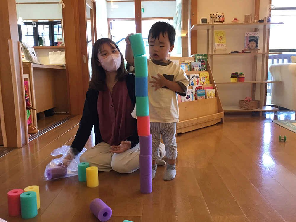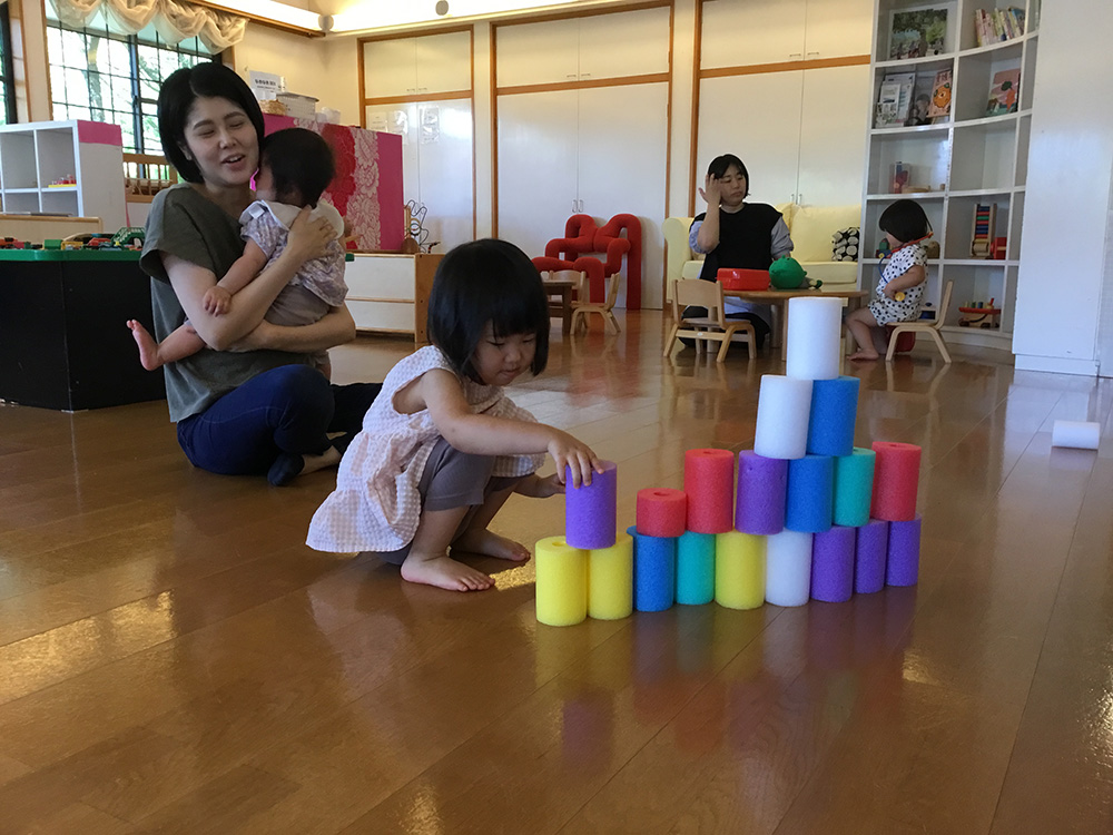 お母さんがチャレンジされている側で、子どもたちもまねをして積んで遊んでいました。お城などの作品を作る子もいて、子どもたちのいろいろなアイデアで遊びが広がりました。