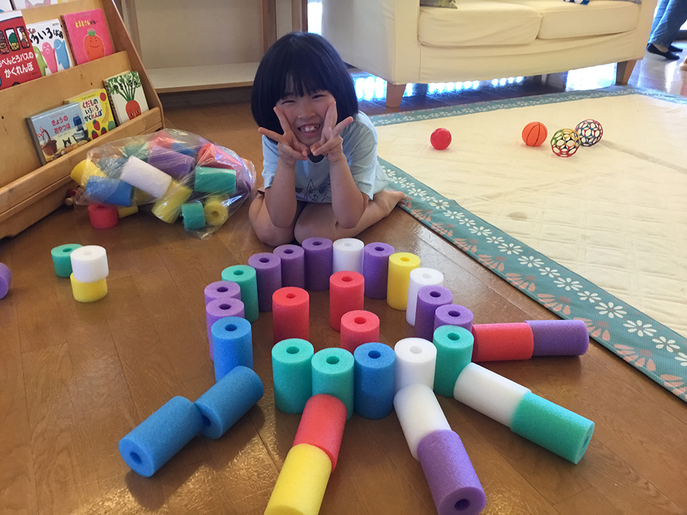 プールスティックの素材は発泡ポリエチレンでとても軽く、高く積んで倒れても痛くないので、小さい子にも安心です。