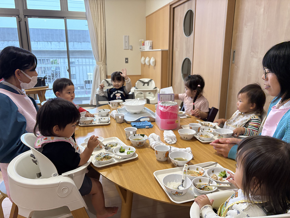 おひさま保育園では、0~2歳児のこども達が同じ空間で食事をしています。