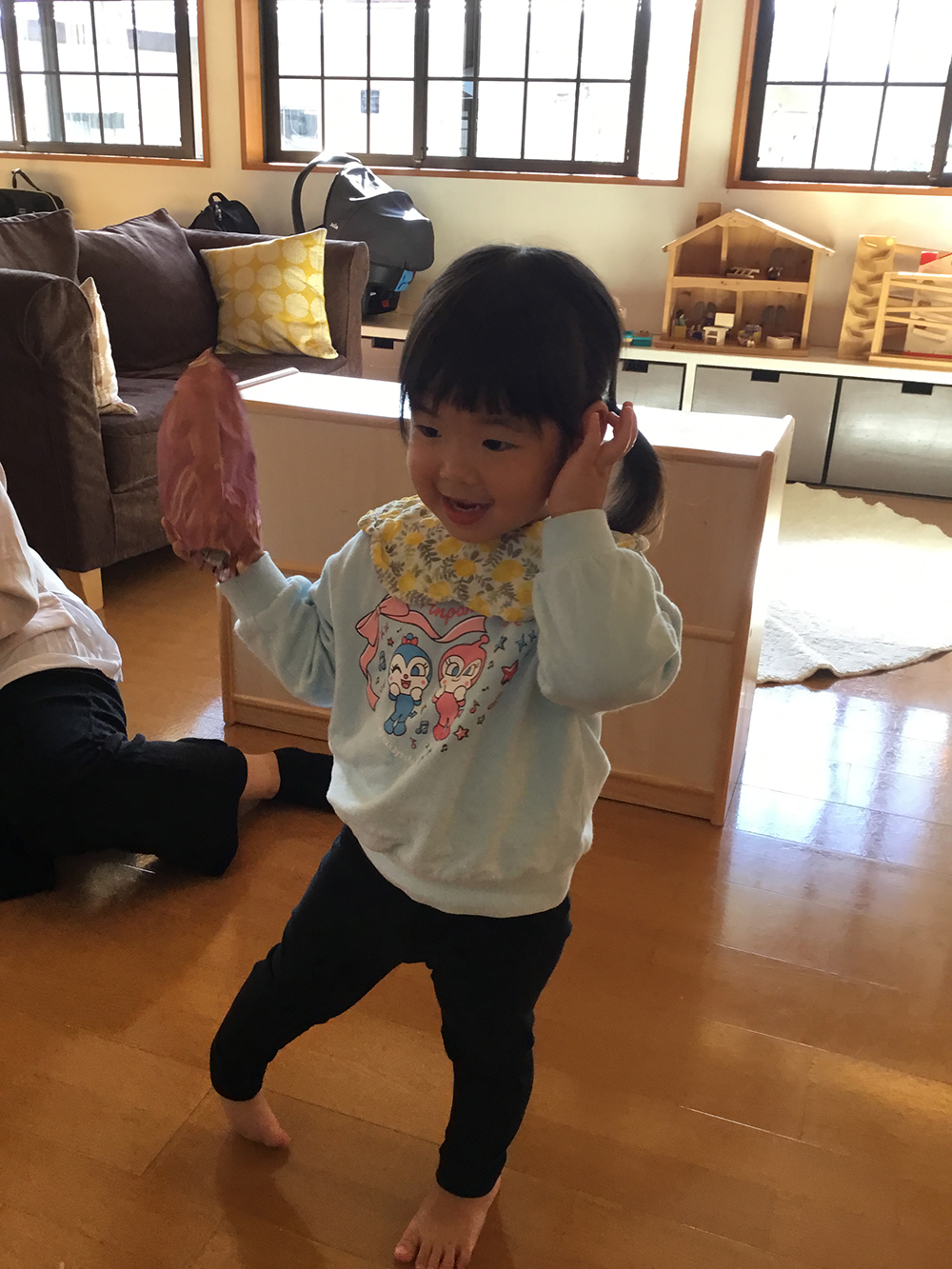 地域の親子さんと、こども園2歳児との合同で「焼き芋ごっこ」を楽しみました。